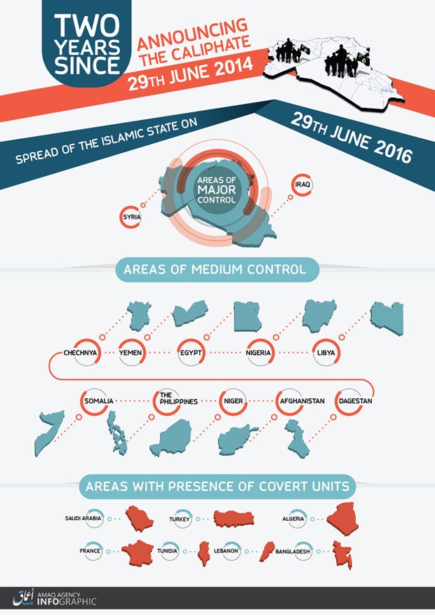 O mapa, que o Daily Star afirma ter sido elaborado pelo Centro Nacional de Contraterrorismo dos EUA, parece confirmar as informações dadas pelo próprio Estado Islâmico numa publicação de 29 de junho de 2016 da Amaq Agency, a agência noticiosa do Estado Islâmico, a marcar os dois anos da proclamação do califado, após uma ofensiva relâmpago no norte do Iraque.
