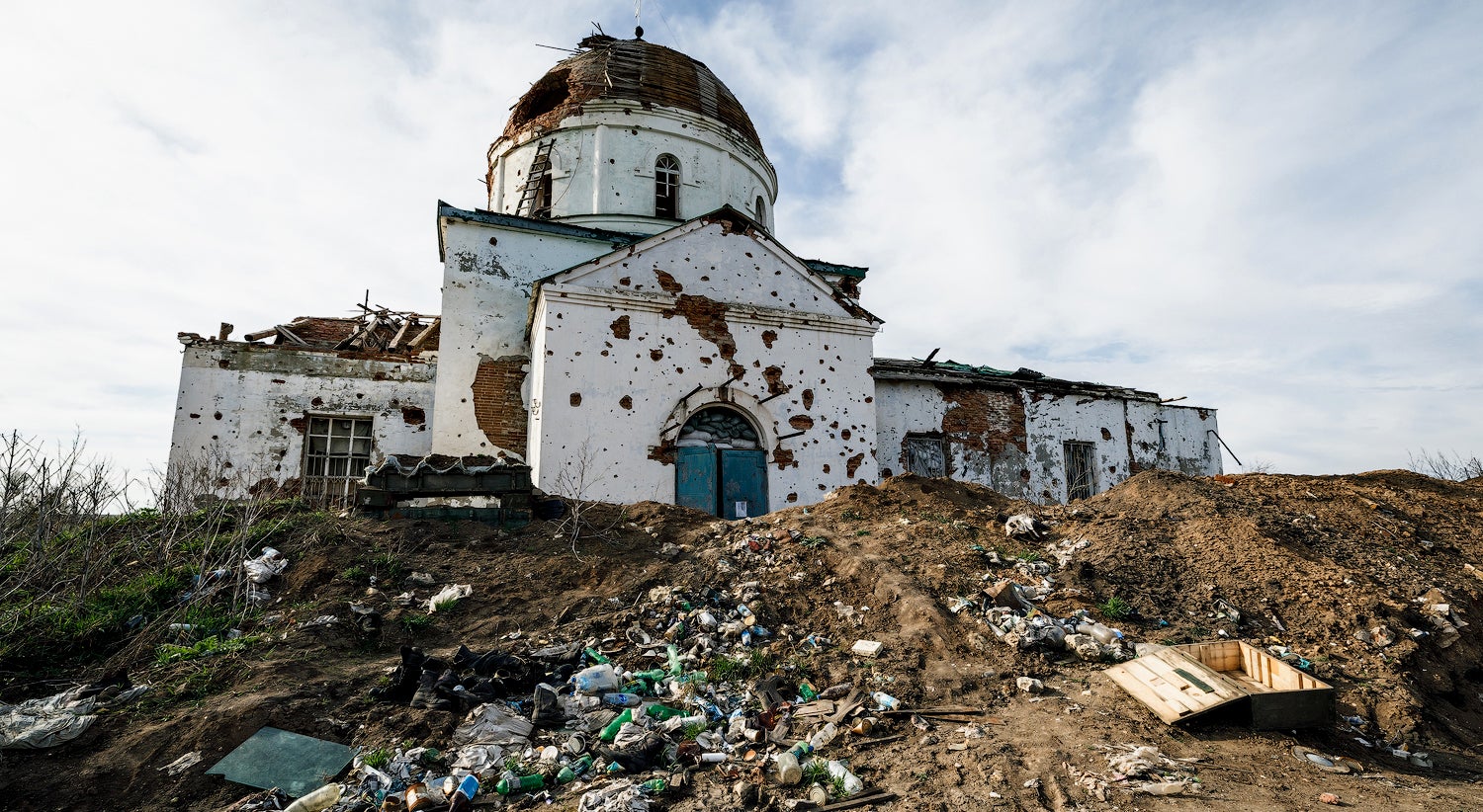 Igreja da Santíssima Trindade, na aldeia de Mala Komyshuvakha, distrito de Izyum, região de Kharkiv, foi construída em 1793, entretanto, com os bombardeamentos russos, ficou em ruínas | Iniciativa de Resposta a Emergências Patrimoniais da Ucrânia