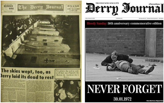 Treze manifestantes católicos desarmados foram mortos por soldados britânicos que dispararam contra uma multidão de pessoas, durante o conflito na Irlanda do Norte, na cidade de Londonderry. Dezenas de pessoas atingidas, uma delas viria a morrer mais tarde devido aos ferimentos, aumentando o balanço negro para 14 mortes. Cinquenta anos depois nenhum militar foi julgado pelo massacre e os familiares ainda lutam por justiça. Esse dia 30 de janeiro de 1972 ficou conhecido por "Domingo Sangrento".
