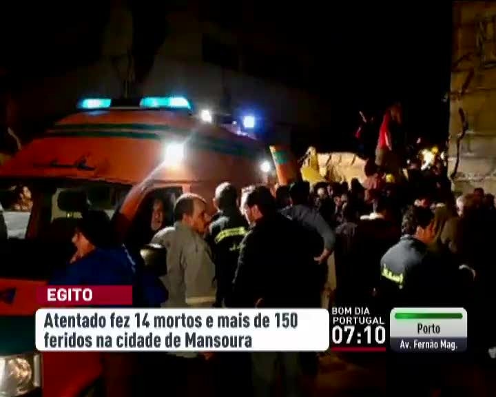 Um duplo atentado bombista em Mansoura causou pelo menos 14 mortos e 150 feridos. Há agentes e civis entre as vítimas. Duas explosões atingiram uma esquadra de polícia e um prédio do Ministério do Interior. As detonações ouviram-se a 20 quilómetros de distância.