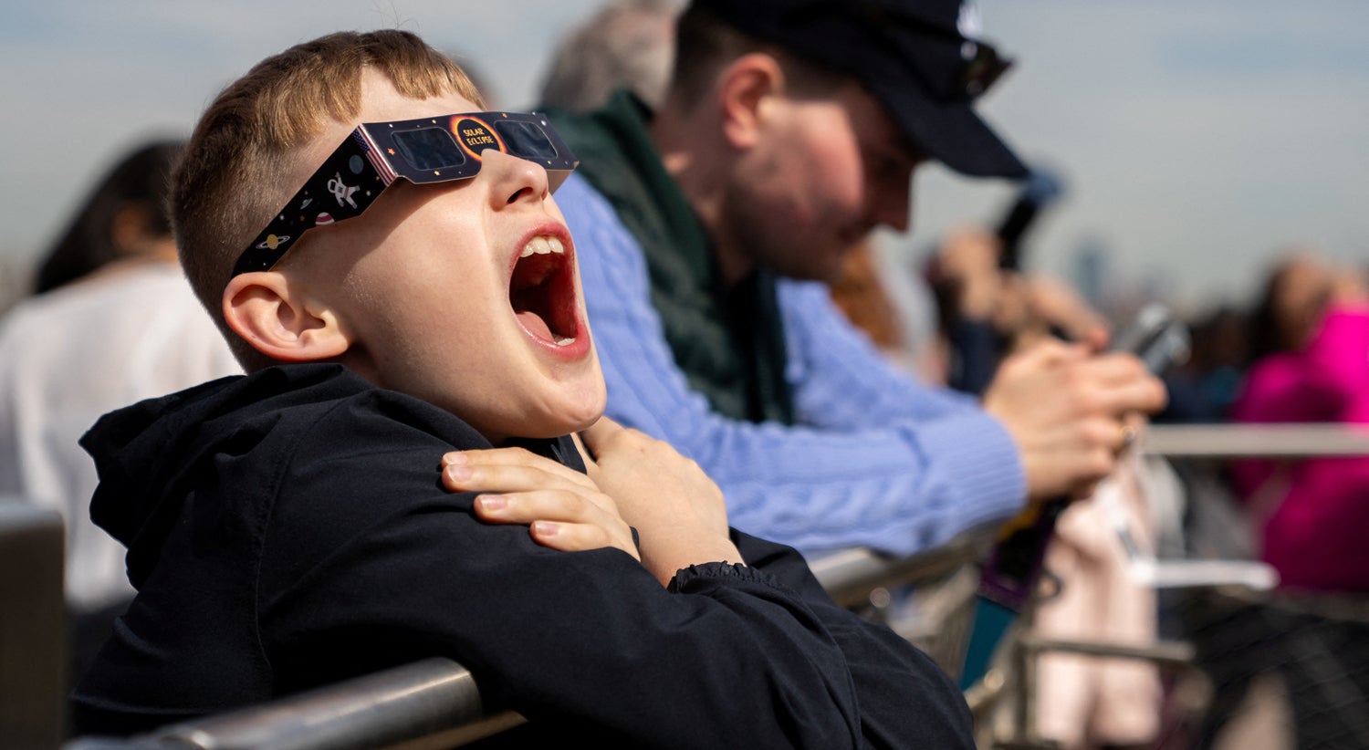 Criança visivelmente admirada ao ver o eclise solar. Estátua da Liberdade em Nova Iorque, EUA | David Dee Delgado - Reuters