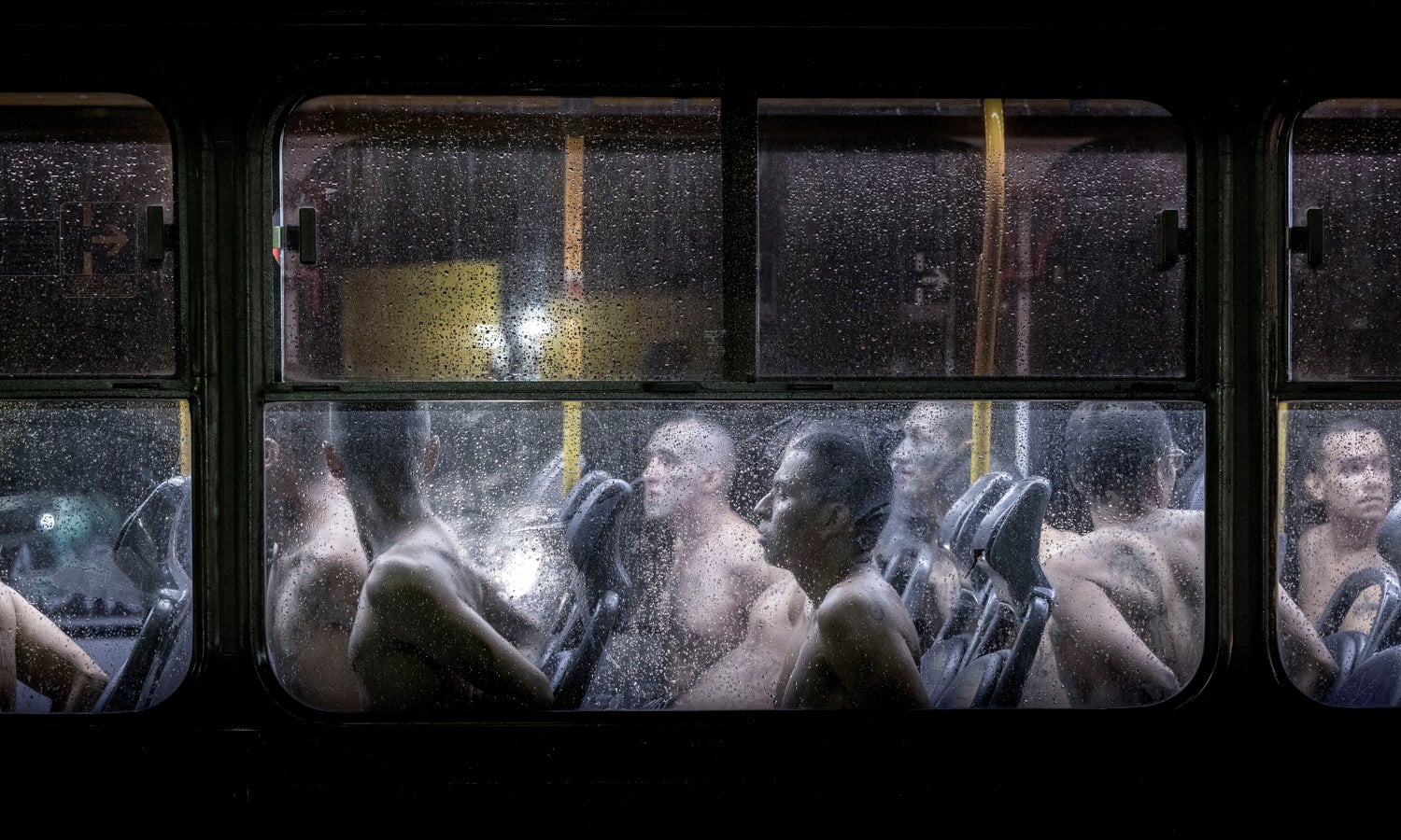 Os presos foram transportados em carrinhas com as mãos algemadas atrás das costas, a cabeça apoiada na cadeira da frente e vestindo apenas uns calções de algodão branco. Transporte dos presos para o CECOT | Secretaria de Imprensa da Presidência via Reuters