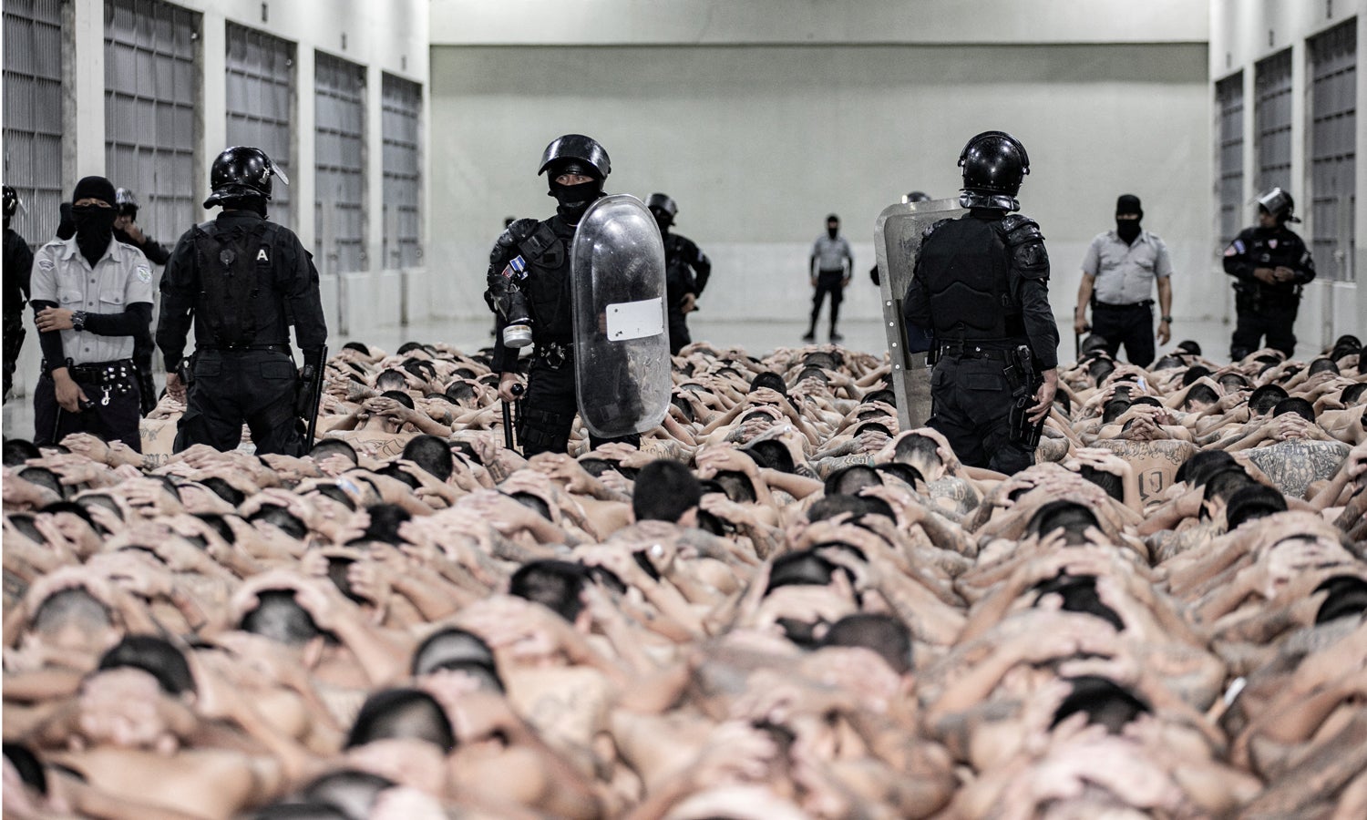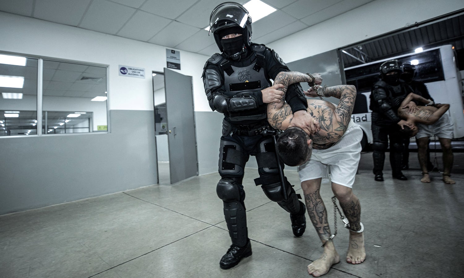 Guardas penitenciários fortemente armados vigiam os recém-chegados membros de gangues, enquanto são verificados os processos no Centro de Confinamento de Terrorismo | Secretaria de Imprensa da Presidência via Reuters