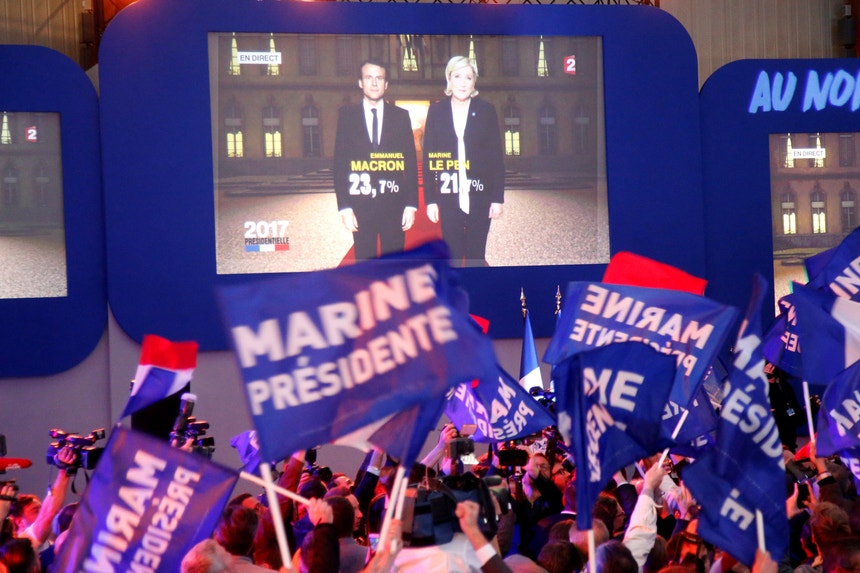 19h00: Televisão pública francesa coloca Le Pen e Macron na segunda volta.