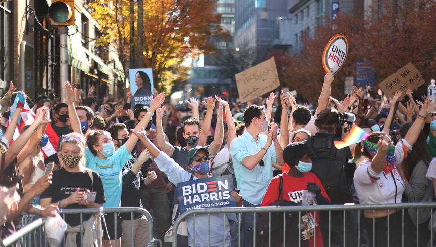 Em Times Square, no centro da cidade, centenas de pessoas concentraram-se para gritar e celebrar a vitória de Biden que, com a projeção da vitória no estado da Pensilvânia, conquistou os 20 delegados ("grandes eleitores") que lhe permitiram obter a maioria dos lugares no Colégio Eleitoral e subir à Casa Branca.