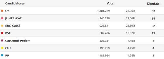 Ao somar-se o número de deputados dos Juntos pela Catalunha e da Esquerda Republicana da Catalunha verifica-se que estes dois partidos conquistam 66 deputados, conseguindo aumentar o número de parlamentares em relação às eleições de 2015 (62).