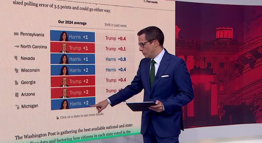 O Washington Post fez uma média final das projeções nos sete Estados decisivos para os resultados das eleições nos Estados Unidos. De acordo com este diário norte-americano, Kamala Harris está à frente em quatro desses Estados: Pensilvânia, Nevada, Wisconsin e Michigan. É, no entanto, muito curta a diferença entre a democrata e Donald Trump.