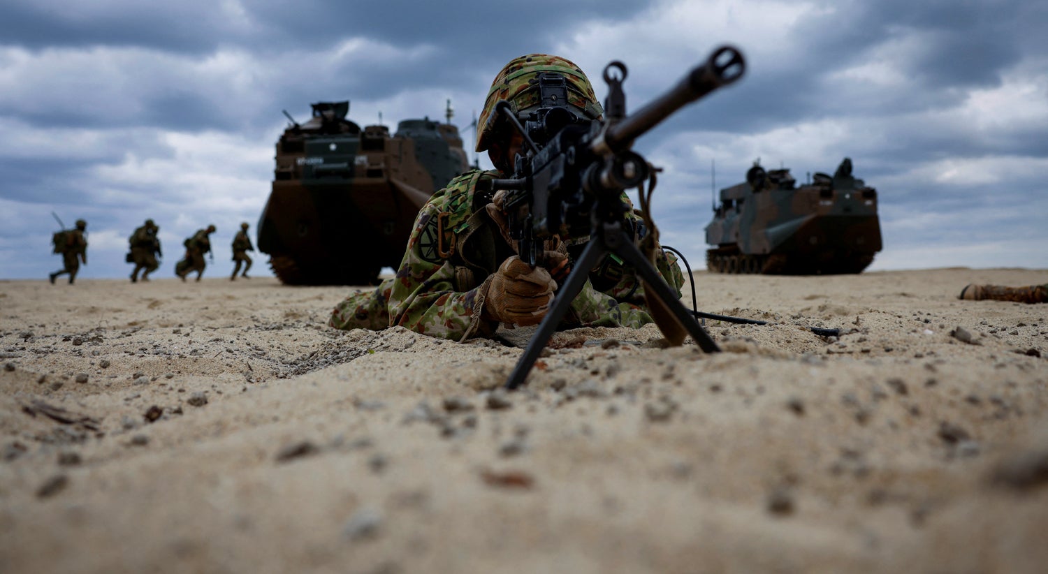 Soldados da Brigada Anfíbia da Força de Autodefesa Terrestre Japonesa participam num exercício militar na ilha de Tokunoshima, Japão | Issei Kato - Reuters