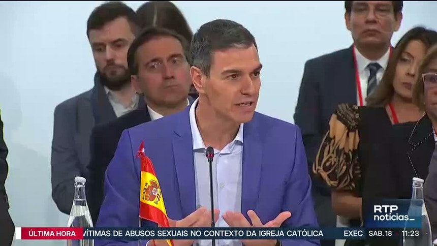 Pedro Sánchez afirma que é preciso reforçar o sistema democrático para enfrentar os riscos que o mundo enfrenta.
