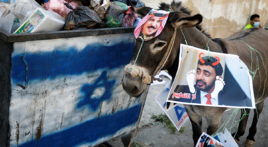 Fotografias do rei do Barém e do ministro dos Negócios Estrangeiros dos Emirados Árabes Unidos foram colocadas num burro durante um protesto na Cisjordânia contra a normalização de laços com Israel. Foto: Raneen Sawafta – Reuters.