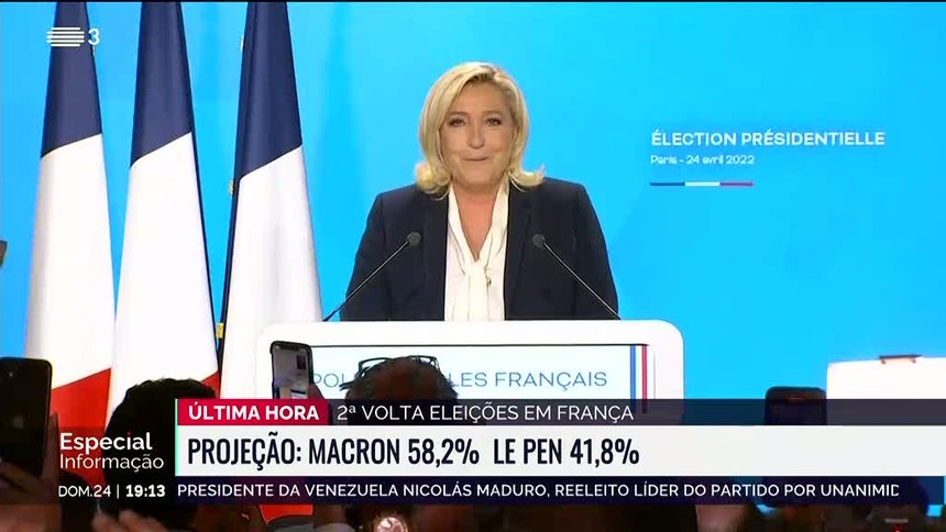 "Por isso, para evitar a tomada do poder por alguns, agora, mais do que nunca, irei continuar com o meu compromisso para com a França e com os franceses, com a energia, a perseverança e a afeição que me conhecem", afirmou Le Pen, com a sala do pavilhão d`Armenonville a responder com uma grande ovação, aplausos e gritos de "Marine, Marine, Marine".