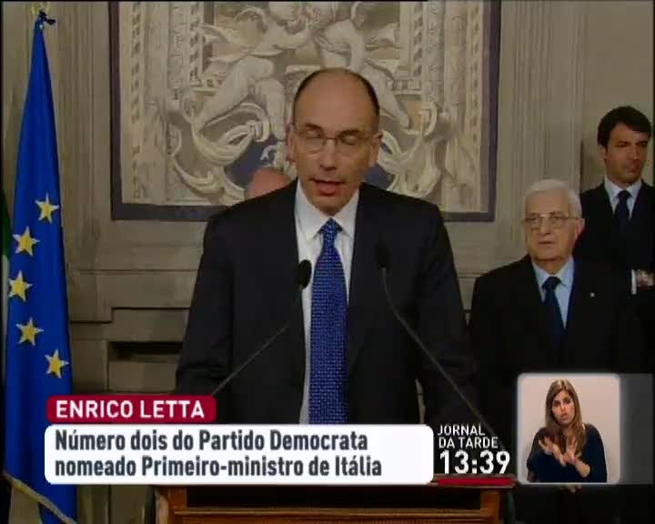 Enrico Letta, número dois do Partido Democrata, de centro-esquerda, foi nomeado primeiro-ministro de Itália,e encarregue de formar governo. Letta tem 46 anos. É considerado um homem do aparelho, uma figura relativamente apagada do partido. Nas primeiras declarações após a nomeação, Letta afirmou que as políticas de austeridade não são suficientes para ultrapassar a crise na Europa. O critério da escolha do presidente Giorgio Napolitano, terá sido a vontade expressa pelos italianos nas últimas eleições, de renovar a classe política.