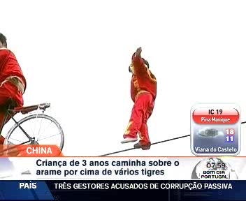 Uma trapezista é a grande vedeta de um circo na China. Tem 3 anos e já se equilibra no arame.