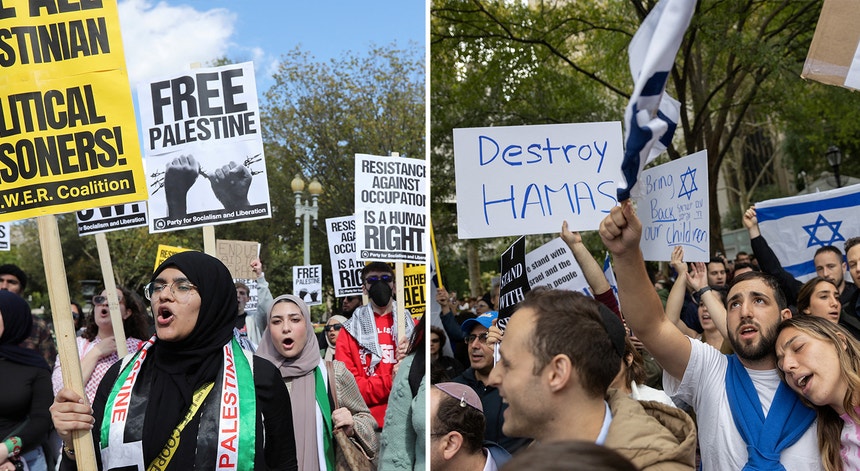 Vários manifestantes pró-Palestina (esq.) e pró-Israel (dir.) manifestam-se nas ruas nos Estados Unidos. | Fotos: Allison Bailey - Reuters (esq.) e Jeenah Moon - Reuters (dir.)