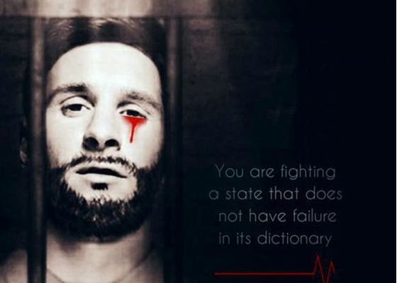 No cartaz, o jogador aparece atrás das grades, como um preso, com o olho esquerdo a sangrar e, numa legenda em inglês, pode ler-se “Vocês estão a lutar contra um Estado que não tem a palavra fracasso no seu dicionário”.