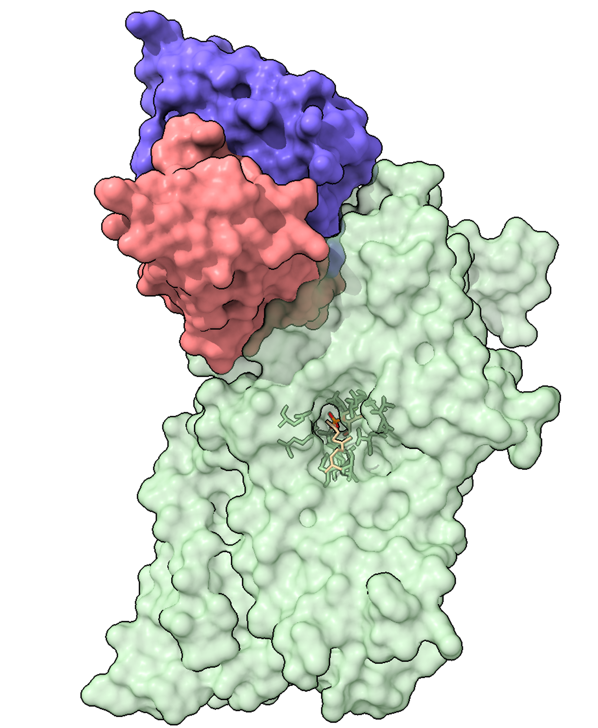 Proteína AftB: Superfície da proteína AftB (verde) determinada por microscopia eletrónica. A imagem ilustra o seu centro ativo com um substrato ligado. Créditos: ITQB NOVA.