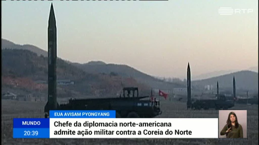 Mundo EUA admitem intervenção militar na Coreia do Norte Os Estados Unidos admitem uma intervenção militar contra a Coreia do Norte. RTP / VER MAIS O secretário de Estado americano está de visita à Coreia do Sul e disse que a opção militar está em cima da mesa. PUB