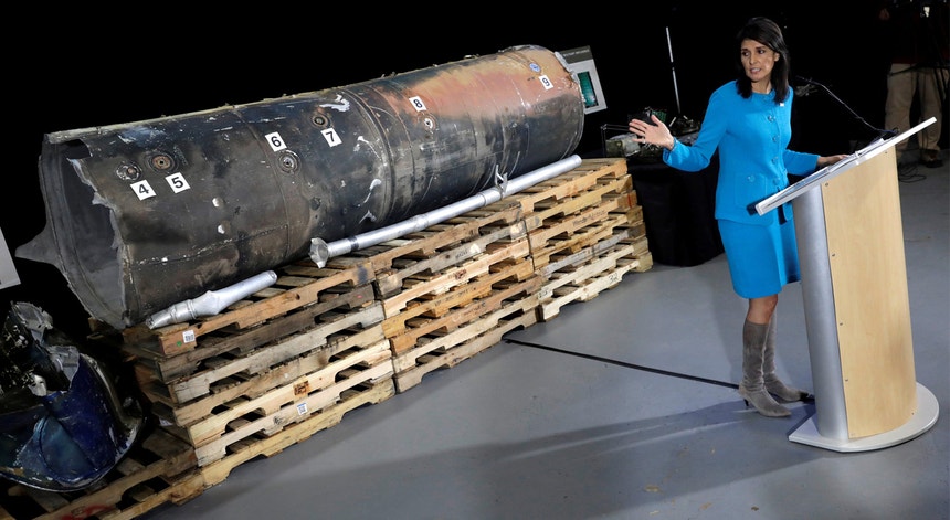 "Atrás de mim estão os destroços recuperados do míssil disparado pelos combatentes Huthis do Iémen sobre a Arábia Saudita. (...) Foi fabricado no Irão antes de ser enviado aos rebeldes Huthis no Iémen”, afirmou a embaixadora dos Estados Unidos junto da ONU, Nikki Haley.
