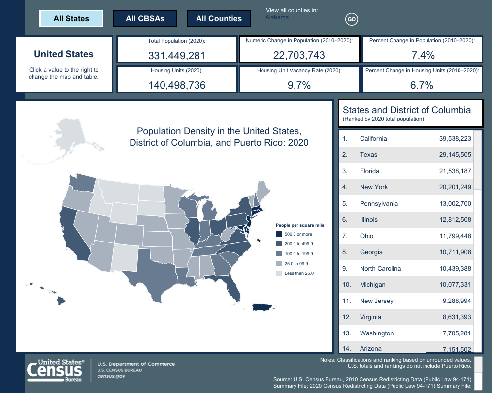 Os dados do gabinete de Censos também confirmam a desaceleração do crescimento populacional nos Estados Unidos, no nível mais baixo de sempre com exceção da década de 1930. Mais de metade de todos os condados dos EUA perderam população de 2010 a 2020, disseram as autoridades que coordenaram a realização do Censo.