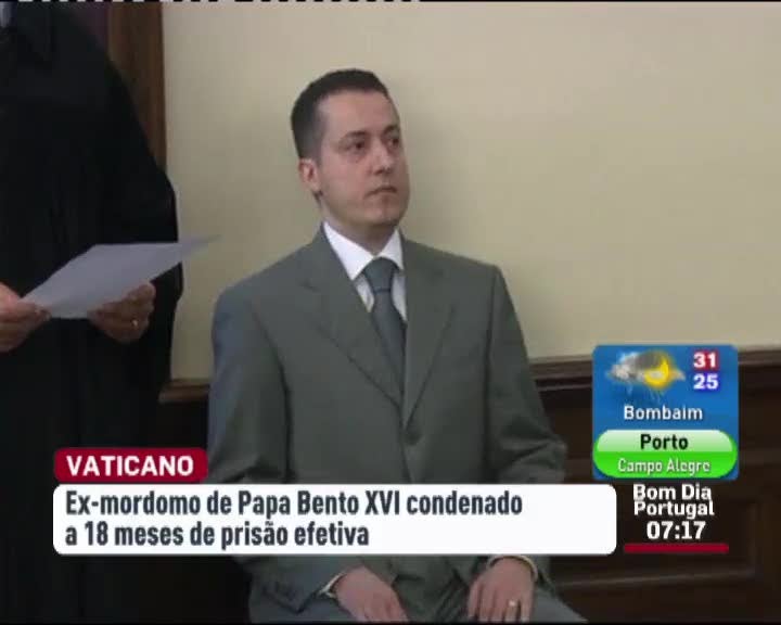 O ex-mordomo do Papa foi condenado pelo tribunal do Vaticano a 18 meses de prisão efetiva. Paolo Gabriele foi considerado culpado do furto e difusão de documentos confidenciais de Bento XVI. Para já está em prisão domiciliária, mas se não recorrer da sentença vai cumprir pena numa cela do Vaticano, vigiado pela Guarda Suíça. Continua ainda em aberto a possibilidade de receber o perdão de Bento XVI. O ex-mordomo do Papa teria como cúmplice um informático da Santa Sé. O suspeito vai ser julgado no Tribunal do Vaticano a 5 de novembro.