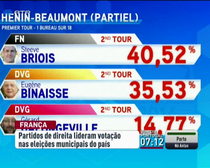 Em França a extrema-direita melhorou a votação nas eleições municipais. A Frente Nacional ganhou pela primeira vez uma câmara no norte do país. No total a Frente Nacional conseguiu 7% dos votos. A direita francesa subiu e lidera com 48%. A esquerda foi penalizada e está nos 43%.
