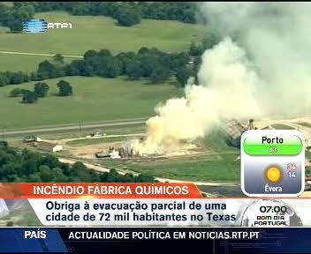 Um incêndio numa fábrica norte-americana no Texas obrigou à evacuação parcial de uma cidade com 72 mil habitantes. Trata-se de um complexo químico, situado em Bryan, uma cidade a cerca de 160 quilómetros de Houston. A nuvem de fumo é visível a dezenas de quilómetros e os bombeiros limitam-se a deixar arder a unidade fabril.