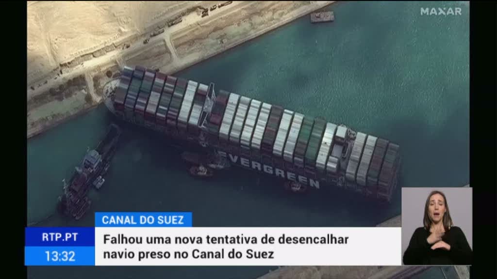 Falhou nova tentativa de desencalhar navio preso no Canal do Suez