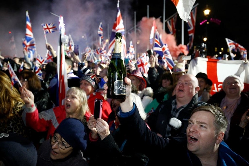 A festa do Brexit juntou milhares de pessoas em frente ao Parlamento em Westminster na noite de sexta-feira.