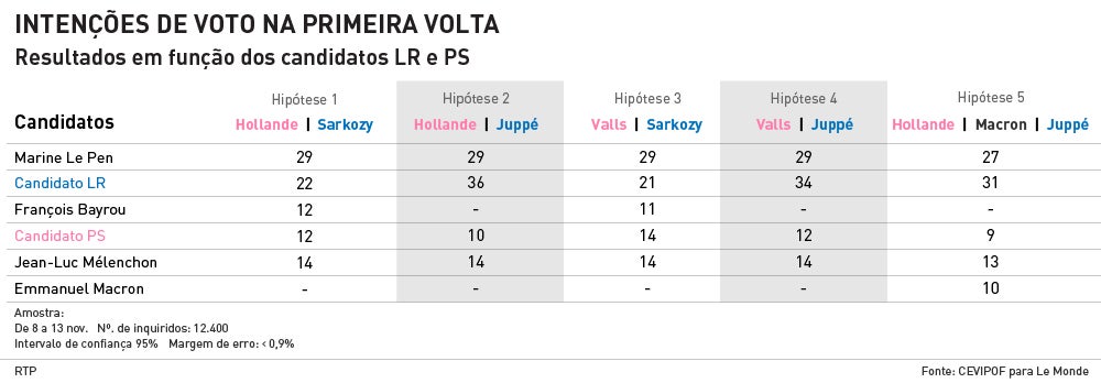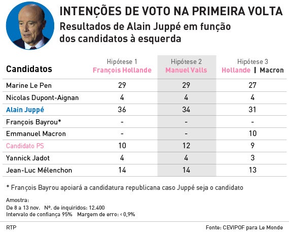 A sondagem publicada na quinta-feira por Le Monde prevê mesmo que Alain Juppé seja o mais votado na primeira volta: teria 36 por cento de votos se François Hollande fosse o candidato do PS e 34 por cento caso a escolha socialista recaísse sobre o primeiro-ministro Manuel Valls.
