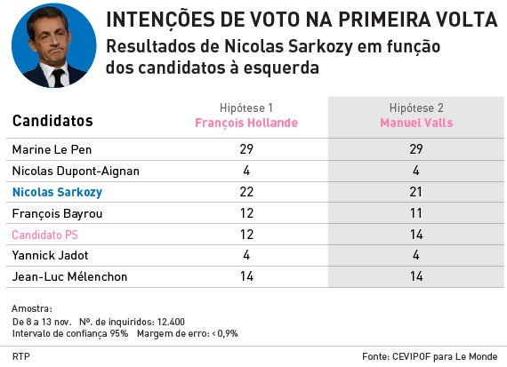 A vitória de Nicolas Sarkozy nesta eleição primária já daria lugar a um cenário diferente. A sondagem de Le Monde prevê que o candidato passe à segunda volta, mas apenas em segundo lugar. Marine Le Pen seria a mais votada na primeira volta.