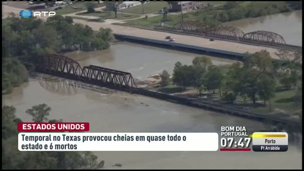 A chuva torrencial deixou vastas áreas submersas. O nível das águas de um rio aumentou de tal forma que quase chegou a uma ponte.