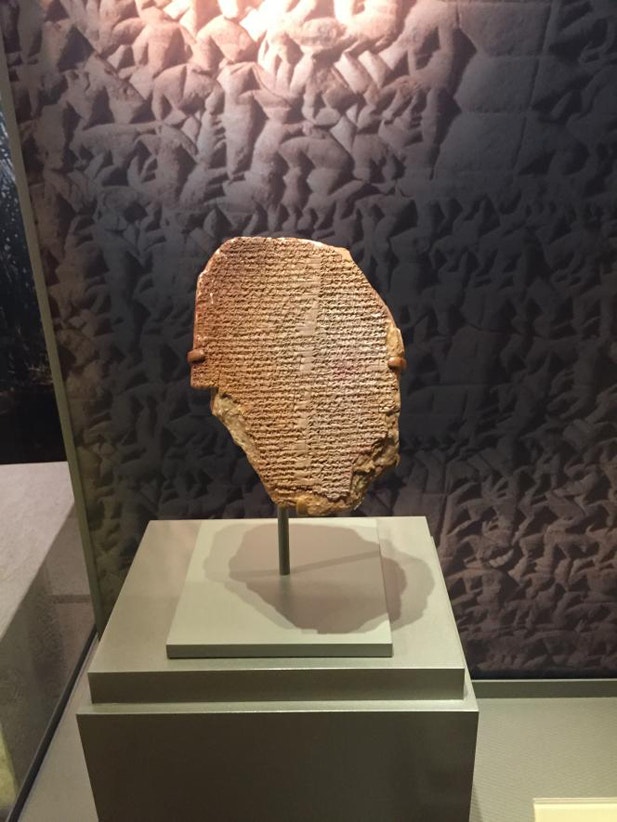 Escrita com caracteres cuneiformes, narra a história do Rei Gilgamesh, que terá vivido uma epopeia em busca da imortalidade. A peça mede aproximadamente 15 centímetros por 12,7 e é um testemunho da língua acádia.