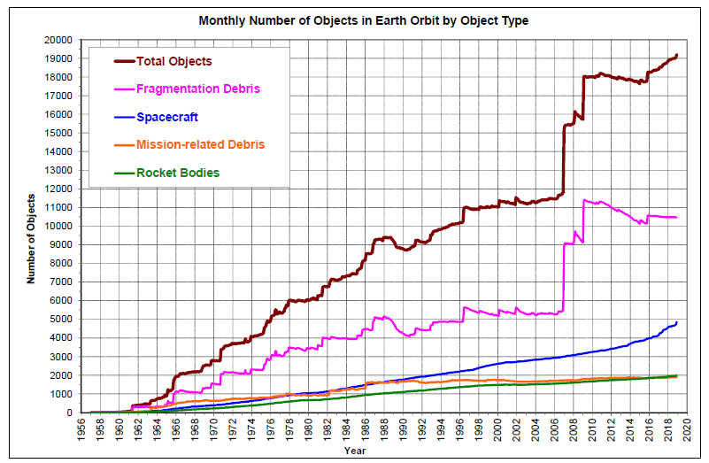 Evolução do número de objetos no espaço nos últimos 60 anos. Fonte: NASA Orbital Debris - 2019