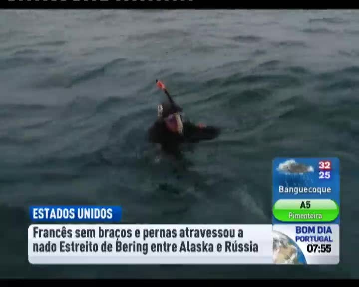 Um nadador francês, sem braços e pernas, atravessou o Estreito de Bering, entre o Alaska e a Rússia. Phillipe Croizon utilizou uma prótese para nadar os quatro quilómetros. A temperatura da água era de apenas 4 graus . O francês já fez uma série de travessias entre diferentes continentes.