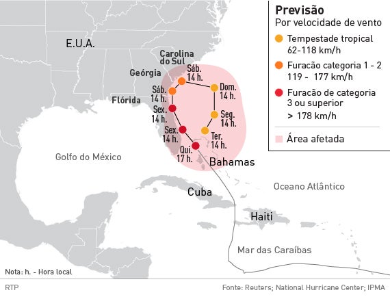 Espera-se agora que o furacão chegue aos Estados Unidos da América esta manhã. Ao longo do dia deve atingir a costa de 965 quilómetros, de Boca Raton, na Florida, até Charleston, na Carolina do Norte, levando água do mar e chuvas fortes para o interior. À medida que se aproxima, o furacão já perdeu força, baixando para a categoria 3 numa escala de 5.