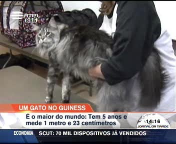 Um gato americano, tem cinco anos chama-se Stewie e mede um metro e 23 centímetros. É o maior gato do mundo e já está no Guiness. Mora no Nevada é da raça Maine Coon, uma raça de felinos conhecida pela raça dos "gigantes gentis".