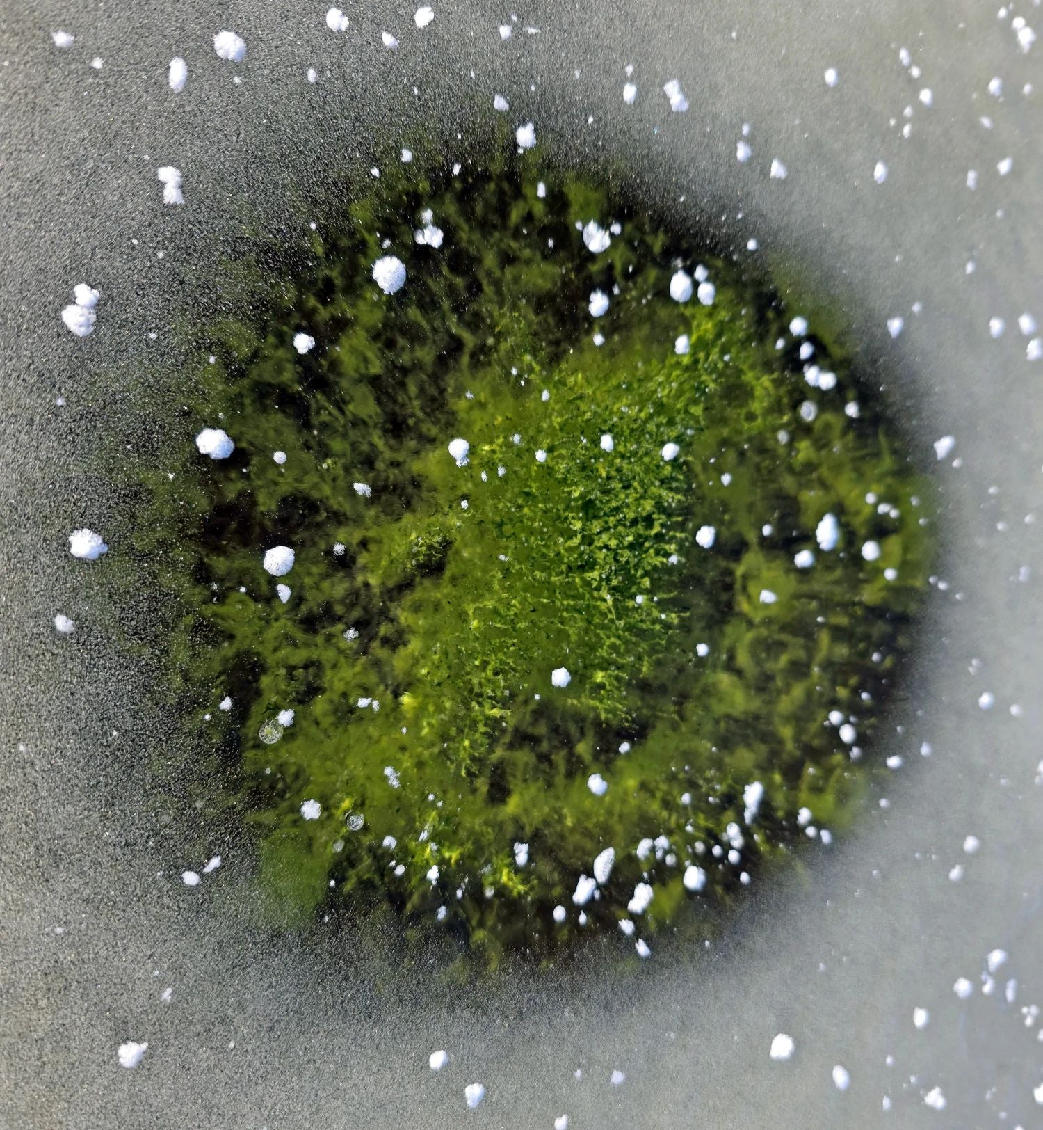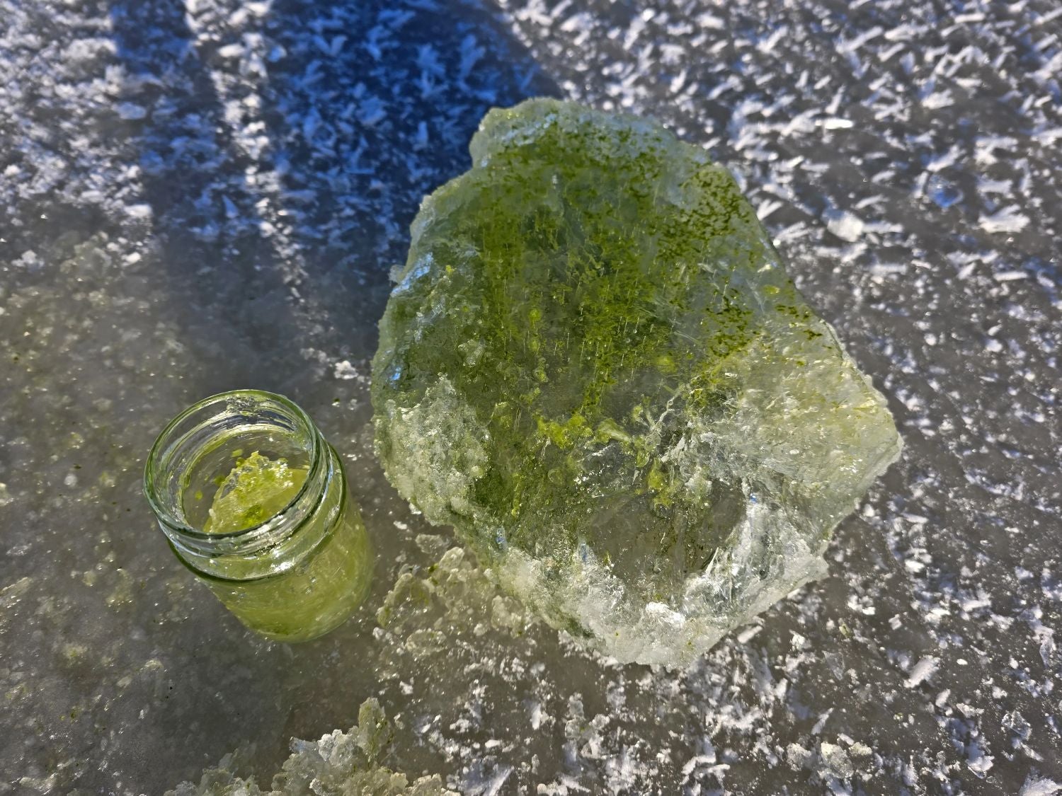 O gelo verde foi mais visível durante o período de aquecimento temporário em torno da véspera de Natal e, após o recongelamento, os chamados "olhos de cianobactérias" foram uma caraterística particularmente proeminente, ou seja, áreas de gelo claro acima de aglomerados de cianobactérias escuras que se formaram por absorção diferencial da radiação solar.