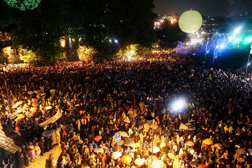 Por este motivo veem-se bandeiras da União Europeia ao lado das bandeiras da Geórgia pelo meio desta manifestação que enche ruas e pontes.