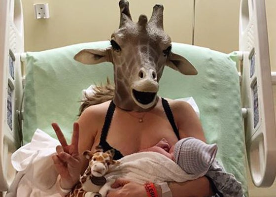 Erin começou com contrações na passada quarta-feira e dirigiu-se para o hospital com a máscara da girafa, onde acabou por dar à luz sem a retirar.