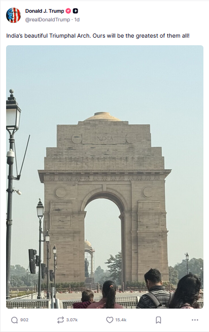 "O belo Arco Triunfal da Índia. O nosso será o maior de todos", escreve Trump na rede social Truth