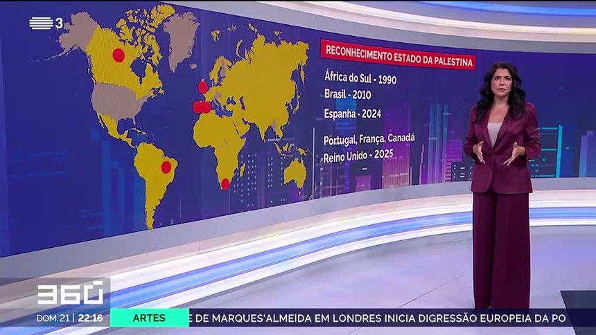 Também o primeiro-ministro do Canadá, Mark Carney, veio entretanto anunciar que o país "reconhece o Estado da Palestina e oferece a sua parceria na construção da promessa de um futuro pacífico tanto para o Estado da Palestina como para o Estado de Israel".