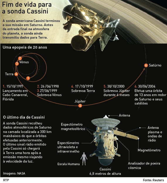 Com 20 anos de existência, a sonda Cassini encerrou esta sexta-feira a sua longa viagem exploratória espacial, depois de dar a conhecer os campos magnéticos do planeta Saturno. Cassini entrou na atmosfera e enviou as últimas informações à Terra, fundindo-se no planeta que ajudou a desvendar.