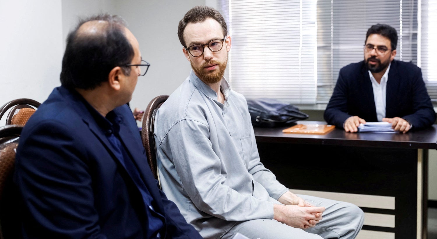 A agência Mizan publicou fotos de Floderus diante dos juízes em farda de prisão azul claro enquanto as acusações eram lidas | Amir-abbas Ghasemi - Mizan/ Wana via Reuters