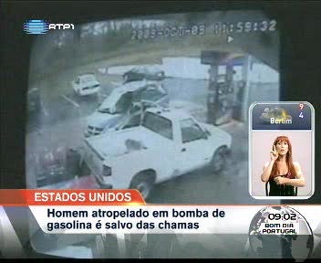 No Estado americano do Ohio um homem foi salvo das chamas após ter sido atropelado numa bomba de gasolina. O momento foi captado pelas câmaras de vigilância do posto de abastecimento. Uma idosa perde o controlo do carro, atropela o homem e choca com a bomba que entretanto se incendeia.