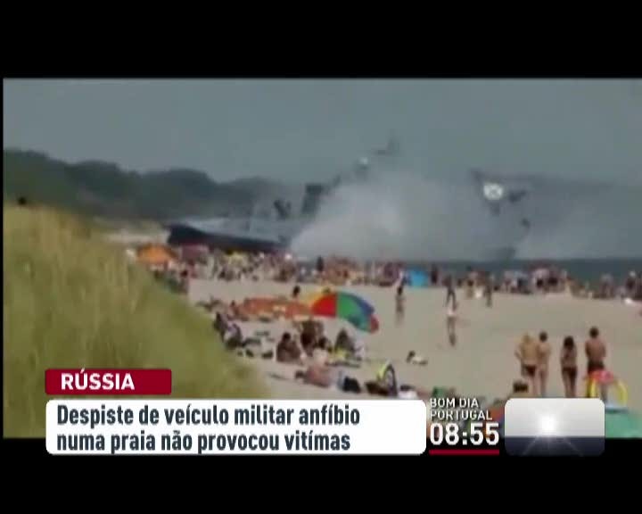 Banhistas de uma praia na Rússia foram surpreendidos com a chegada de um veículo militar anfíbio de 500 toneladas. Um hovercraft gigante, com capacidade para 400 pessoas, atracou na praia obrigando os banhistas a fugir.
