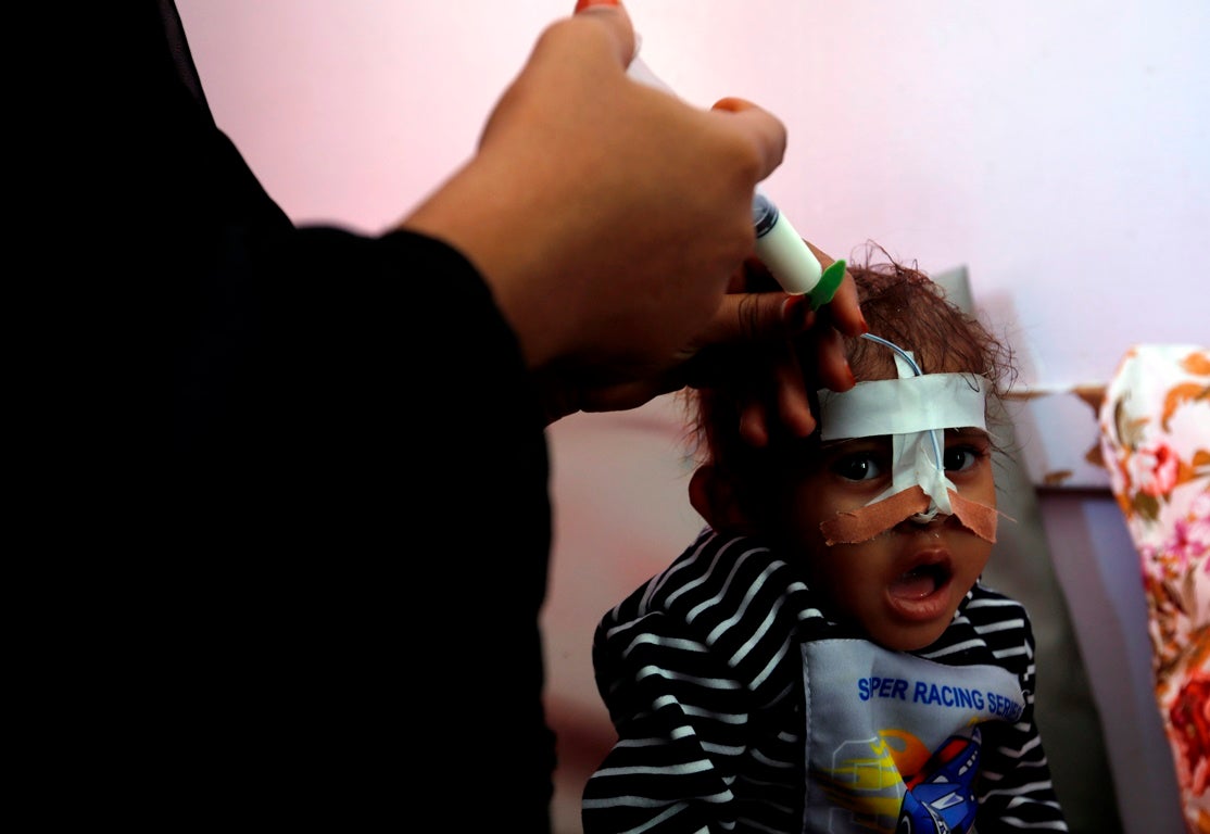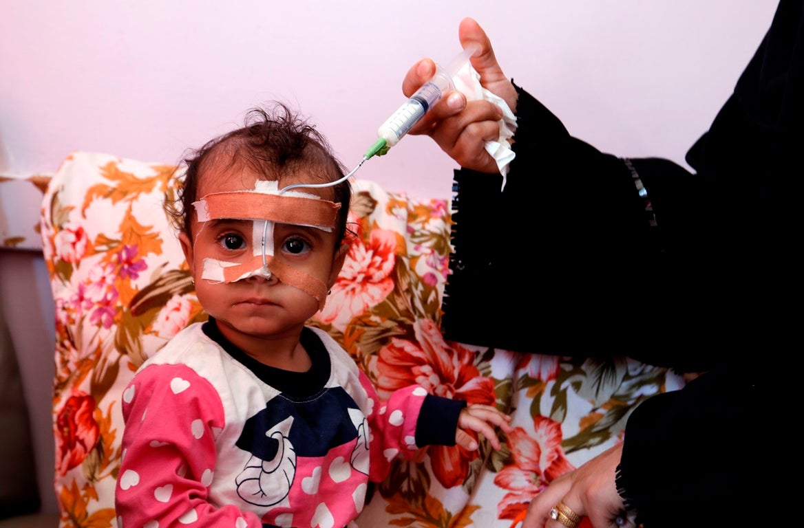 Menina internada por sofrer de malnutrição. Alimentação feita por sonda. Unidade de Saúde apoiada pela ONU | Foto: Yahya Arhab - EPA