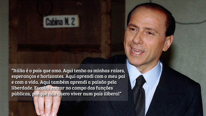 Constrói o império televisivo italiano e expande-o além-fronteiras. Em 1986, junta o futebol à televisão e ao imobiliário com a compra do AC Milan, clube que eleva ao estatuto de colosso mundial. Faltava-lhe a política e o caso Mãos Limpas deu-lhe a oportunidade que precisava. Em 1994, anuncia a fundação da Força Itália numa mensagem transmitida pela televisão.