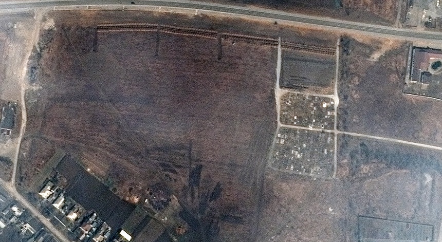 Imagens de satélite captadas pela empresa norte-americana Maxar Technologies indiciam a existência de mais de duas centenas de valas comuns próximas de Mariupol. As autoridades desta cidade portuária do sul da Ucrânia acusam as forças russas de terem enterrado nove mil civis para ocultar um morticínio.