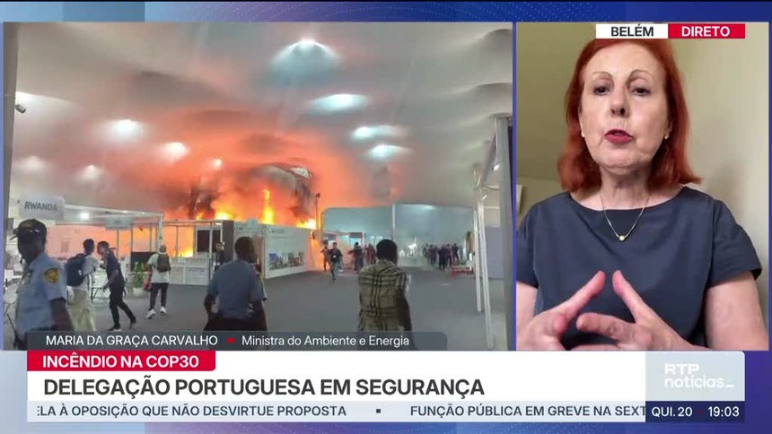Um incêndio que deflagrou no Pavilhão África obrigou esta tarde a evacuar o recinto onde decorre a cimeira do clima - COP30, em Belém, no Brasil. Em entrevista à RTP, a ministra do Ambiente e da Energia garantiu que os portugueses foram "dos primeiros a sair" e "estão bem".