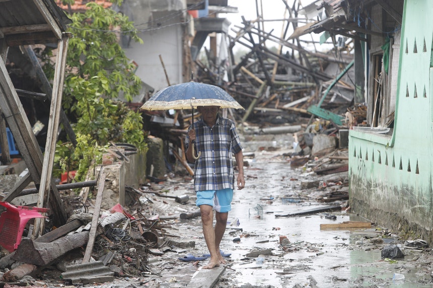 Com luvas para evitar cortes, uma patrulha de oficiais da Agência Nacional de Gestão de Catástrofes (BNPB) levanta um a um os destroços de madeira e ramos que há três dias formavam uma cabana turística na praia Carita, na parte noroeste da ilha de Java, noticia a agência EFE.
